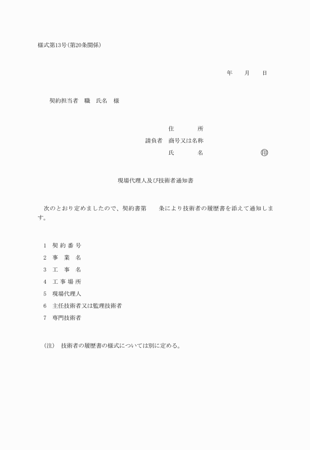第20条 請負者は、現場代理人並びに工事現場における法第26条第1項に規定する主任技術者(同条第2項の規定に該当する場合には監理技術者)及び法第26条の2に規定する技術者(以下これらを総称して「技術者」という。)を定め、現場代理人及び技術者通知書(様式第13号)により契約担当者に通知しなければならない。その変更のあったときも同様とする。