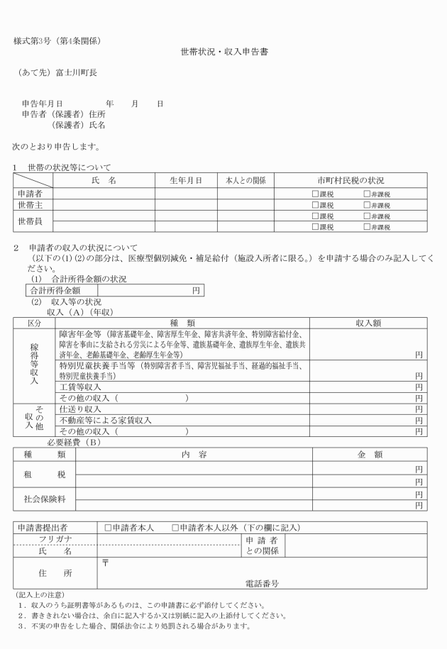 2 省令第18条の6第2項第1号及び第2号に規定する書類は、世帯状況・収入申告書(様式第3号)とする。