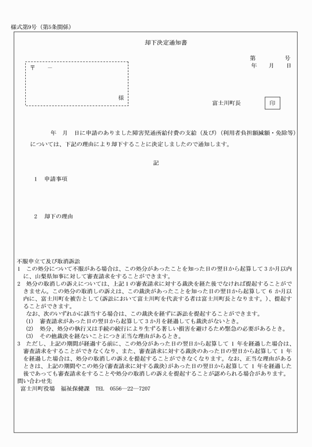 3 町長は、省令第25条の26の3第1項に規定する申請があったときは、障害児相談支援給付費の支給の要否を決定し、計画相談支援給付費・障害児相談支援給付費支給(却下)通知書(様式第24号)により当該申請者に通知するものとする。