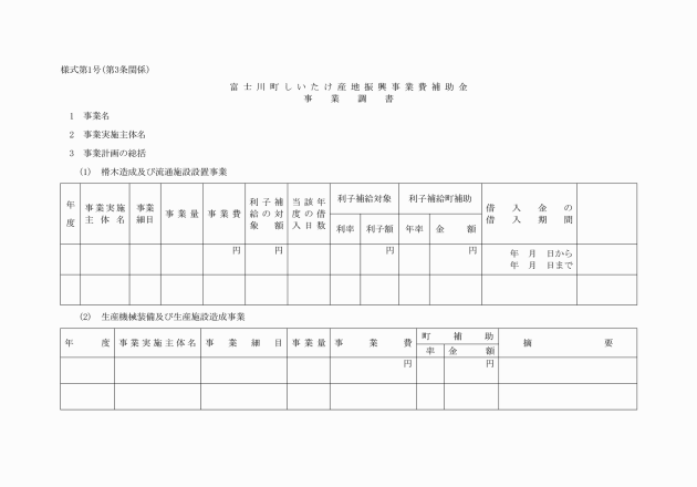 (2) 前号のエに該当する事業のうち富士川町しいたけ産地振興事業については10パーセントを、森林組合森林造成資金利子補給事業、富士川町間伐促進総合対策事業については20パーセントを超える変更をしようとする場合に計画変更承認申請書を提出する。