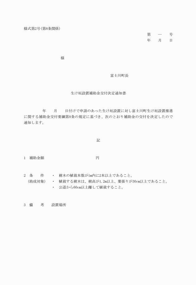 第6条 補助金の交付を受けようとする者(以下「申請者」という。)は、生け垣設置補助金交付申請書(様式第1号)を町長に提出しなければならない。