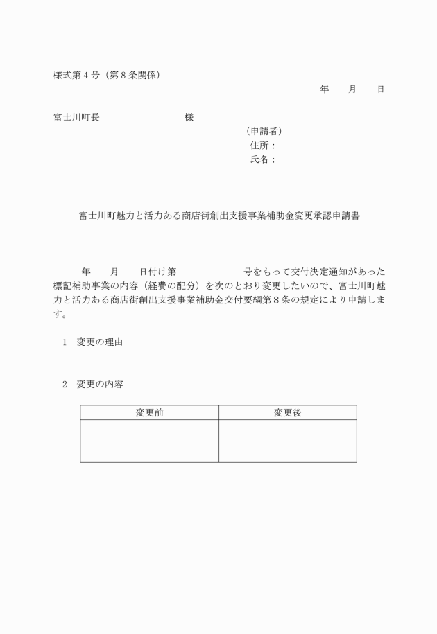 第8条 補助団体は、事業の内容及び経費の配分を変更しようとするときは、あらかじめ、富士川町魅力と活力ある商店街創出支援事業補助金変更承認申請書(様式第4号)を町長に提出し、その承認を受けなければならない。ただし、補助金の額に影響を及ぼさない内容の変更については、この限りでない。