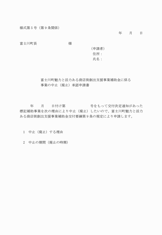 第9条 補助団体は、補助事業を中止し、又は廃止しようとするときは、あらかじめ、富士川町魅力と活力ある商店街創出支援事業補助金に係る事業の中止(廃止)承認申請書(様式第5号)を町長に提出し、その承認を受けなければならない。