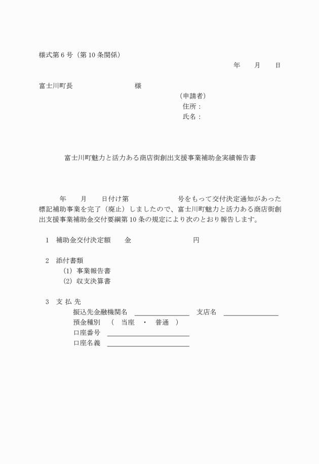 第10条 補助団体は、補助事業が完了したときは、その日から起算して1月を経過した日又は補助金の交付決定をした年度の翌年度の4月10日のいずれか早い期日までに富士川町魅力と活力ある商店街創出支援事業補助金実績報告書(様式第6号)に次の書類を添えて、町長に報告しなければならない。