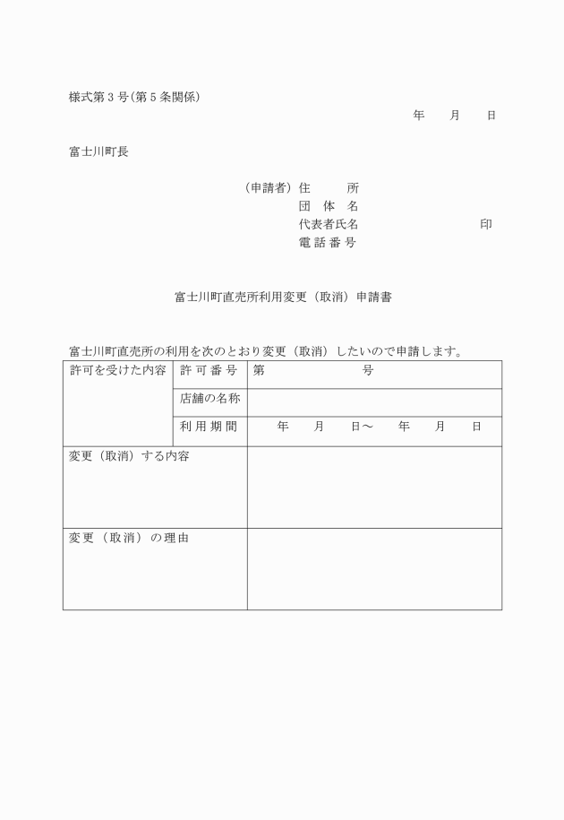第5条 利用者が、利用の許可を受けた事項を変更し、又は取り消すときは、富士川町直売所利用変更(取消)申請書(様式第3号)に当該使用許可書を添えて提出しなければならない。