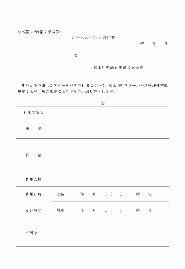 第6条 スクールバスに乗車しようとする児童生徒等は、スクールバス乗車申請書(様式第1号)を教育委員会に提出し、許可を受けなければならない。