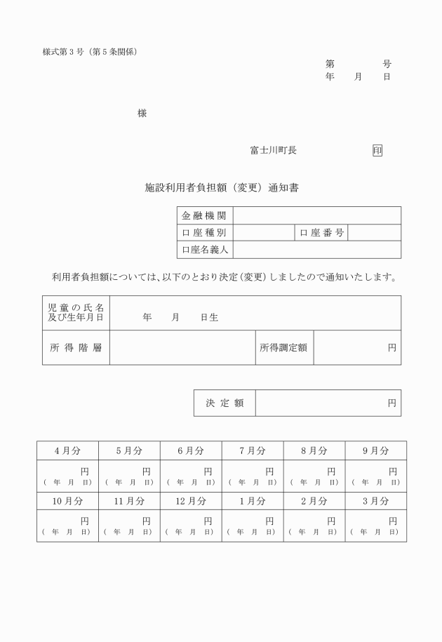 第5条 町長は、教育・保育給付認定を行ったときは、その結果を教育・保育給付認定保護者に通知しなければならない。この場合において、町長は、施設型給付費・地域型保育給付費支給認定証(様式第2号。以下「支給認定証」という。)を当該教育・保育給付認定保護者に交付するものとする。