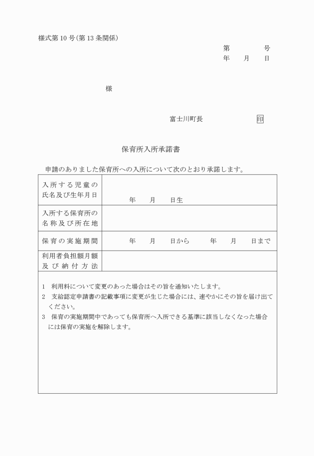 第12条 町長は、富士川町保育の必要性の認定に関する条例(平成26年条例第24号)第3条第1項各号のいずれかに該当する場合には、保育所への入所を承諾するものとする。