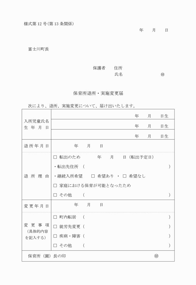 第13条 町長が行う保育所への保育の実施及びこの解除に当たっては、その事務処理の経過を明らかにし、その適正な運用を図るため、次に掲げる書類を用いてこれを行うものとする。