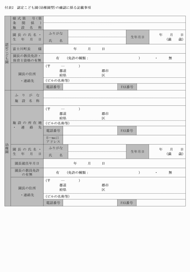 第28条 法第31条第1号の規定による確認を受けようとする教育・保育施設の設置者は、特定教育・保育施設確認申請書(様式第40号)に、次に掲げる書類を添えて、町長に提出しなければならない。