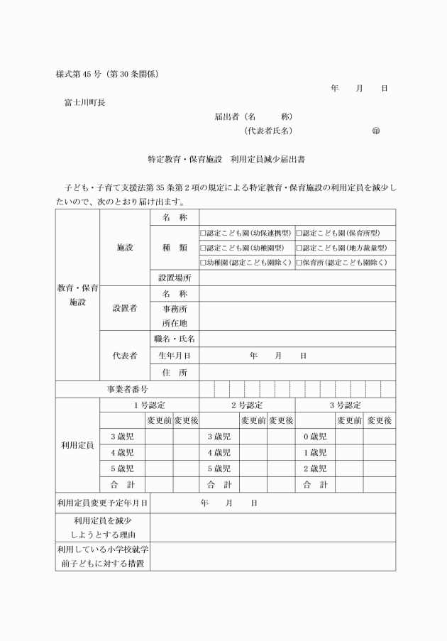 3 法第35条第2項の規定による利用定員の減少をしようとする特定教育・保育施設の設置者は、特定教育・保育施設利用定員減少届出書(様式第45号)により町長に届け出なければならない。