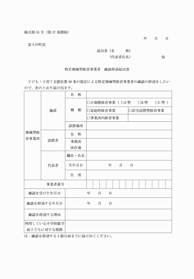 第37条 法第48条の規定による確認の辞退をしようとする特定地域型保育事業者は、特定地域型保育事業者確認辞退届出書(様式第55号)により町長に届け出なければならない。