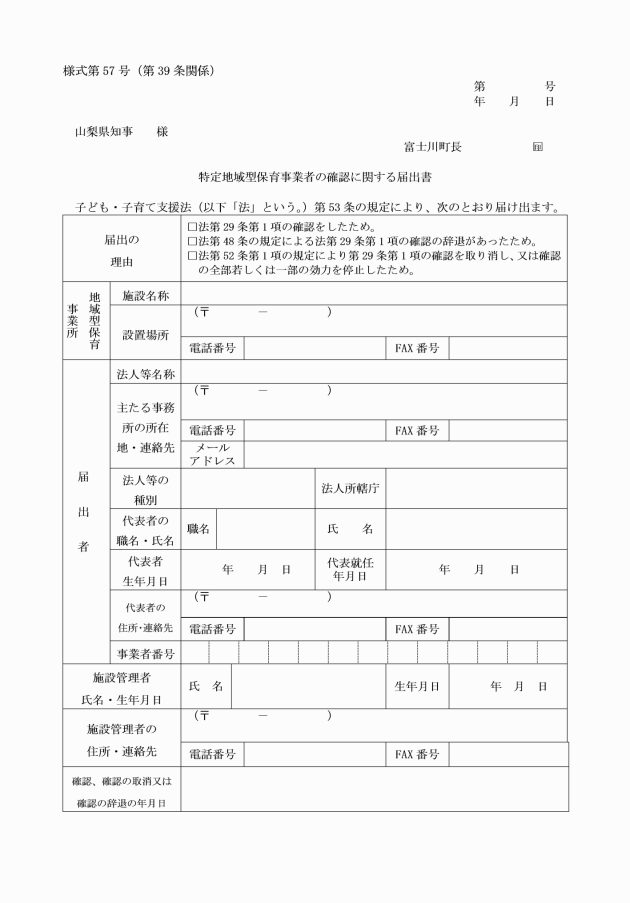第39条 町長は、法第53条の規定による届出について、遅滞なく、特定地域型保育事業者の確認に関する届出書(様式第57号)により山梨県知事に届け出るとともに、これを公示しなければならない。