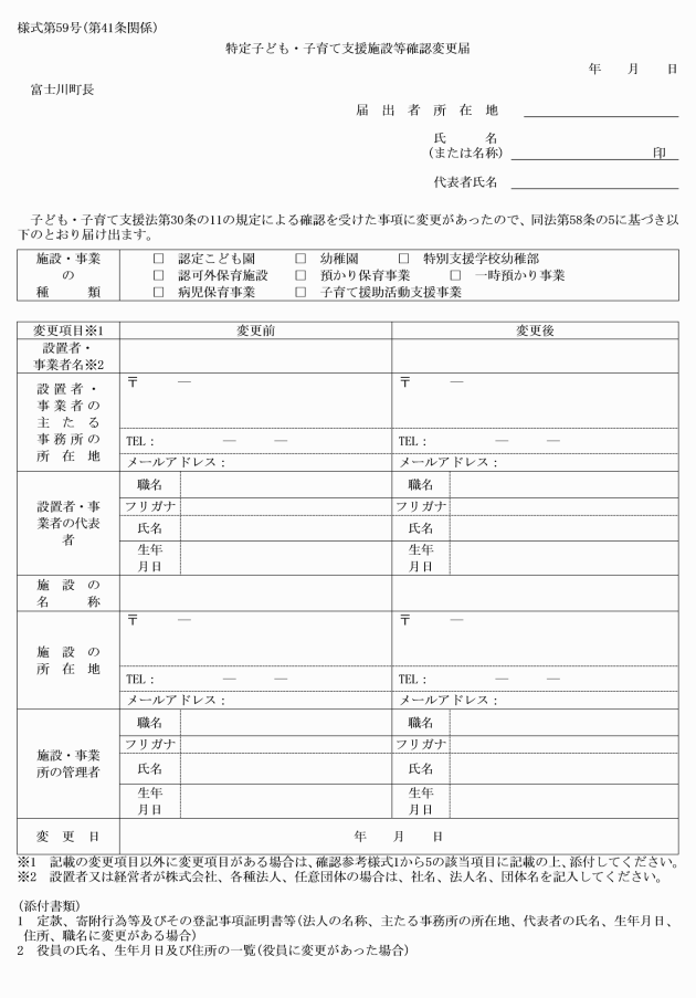 第41条 法第58条の5の規定による届出は、特定子ども・子育て支援施設等確認変更届(様式第59号)により行うものとする。