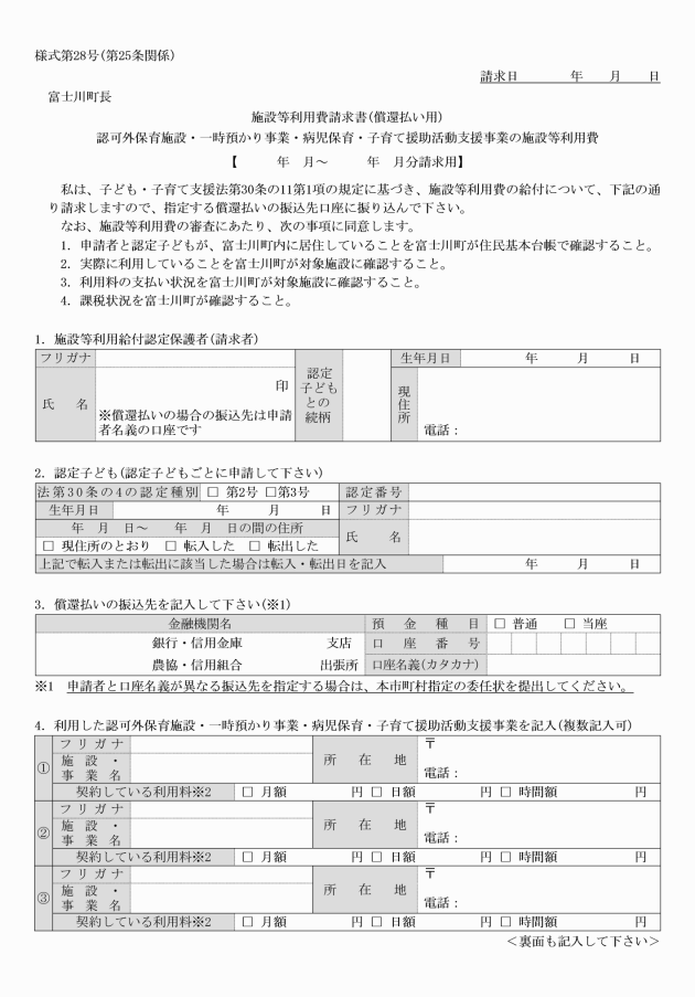 (2) 法第7条第10項第4号に掲げる施設又は同項第6号から第8号までに掲げる事業 施設等利用費請求書(償還払い用)(様式第28号)