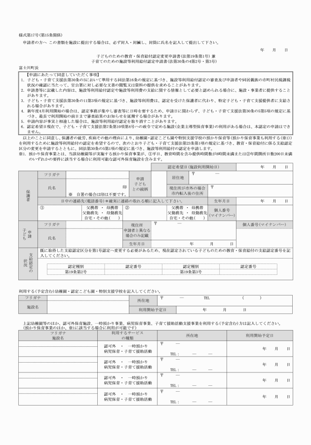 (3) 法第23条第2項の教育・保育給付認定の変更の認定(府令第10条第1号に掲げる事項に係る変更の認定に限る。)と併せて法第30条の4第2号又は第3号に掲げる小学校就学前子どもの区分に係る認定を受けようとする場合 子どものための教育・保育給付認定変更申請書兼子育てのための施設等利用給付認定申請書(様式第17号)