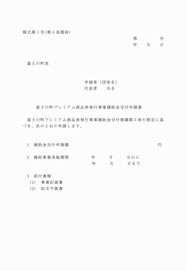 第5条 商工会は、補助金の交付を受けようとするときは、富士川町プレミアム商品券発行事業補助金交付申請書(様式第1号)に次に掲げる書類を添付して、町長に申請しなければならない。