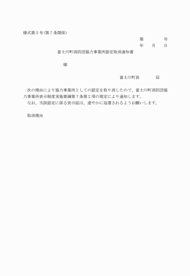 第5条 町長は、表示証の交付に際して、富士川町消防団協力事業所表示証交付整理簿(様式第4号)を備え付け、協力事業所の名称、住所、表示有効期間等の必要事項を記録するものとする。