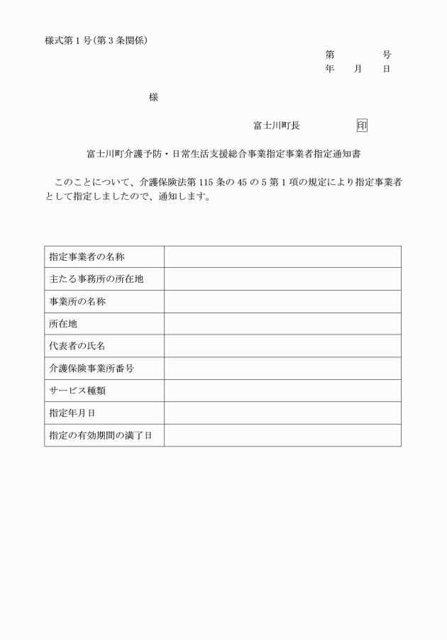 第7条 町長は、法第115条の45の9の規定により、指定事業者の指定を取り消し、又は期間を定めてその指定事業者の指定の全部若しくは一部の効力を停止したときは、富士川町介護予防・日常生活支援総合事業指定事業者指定取消し・停止通知書(様式第5号)により、当該指定の取消し又は停止に係る者に通知するものとする。