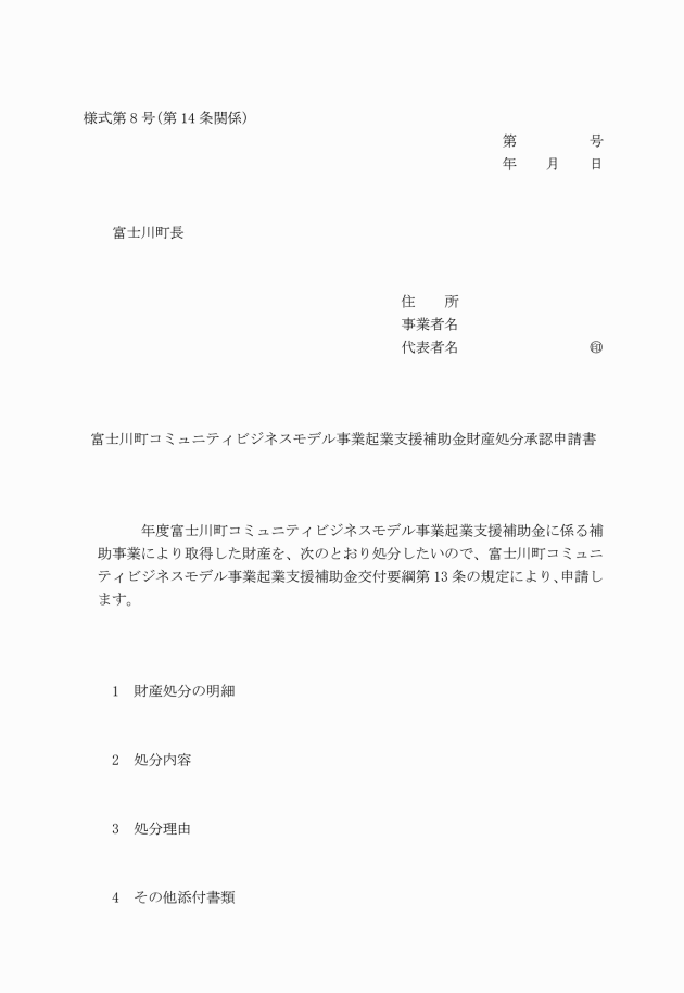 第7条 補助金の交付を受けようとする者(以下「申請者」という。)は、富士川町コミュニティビジネスモデル事業起業支援補助金交付申請書(様式第1号)に必要な書類を添えて、町長に提出しなければならない。