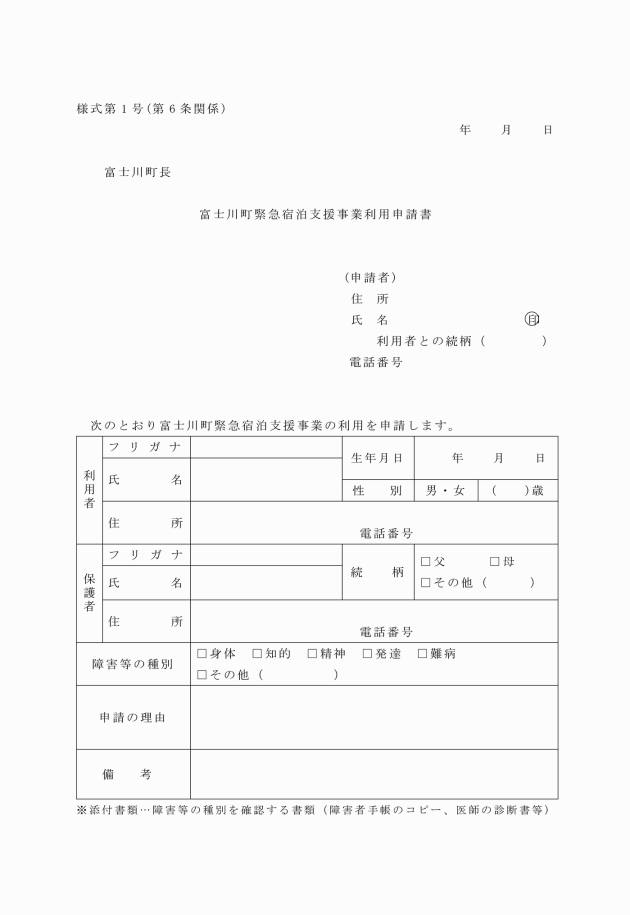 第5条 事業を利用できる者は、富士川町地域生活支援事業実施要綱(平成22年富士川町訓令第33号)第4条各号に掲げる者であって、町長が次の各号のいずれかに掲げる理由により緊急援助等の必要があると認めるものとする。ただし、介護保険法等その他の施策の対象となる者は除くものとする。