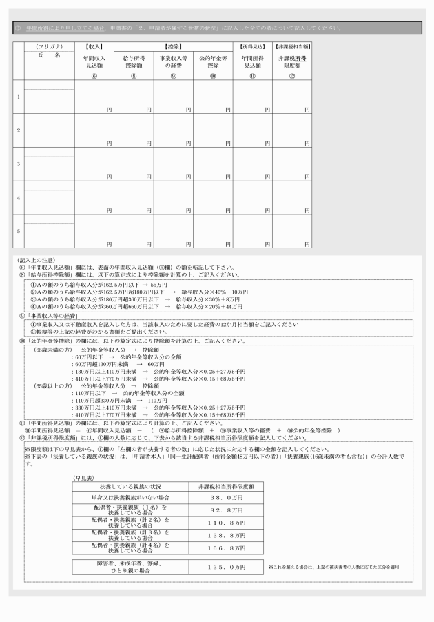 ア 同一の世帯に属する者のうち、予期せず家計が急変し、令和5年度分の市町村民税均等割が課されているもの全員のそれぞれの1年間の収入見込額(令和5年1月以降の任意の1箇月の収入に12を乗じて得た額をいう。)が、市町村民税均等割が非課税となる水準に相当する額以下である世帯