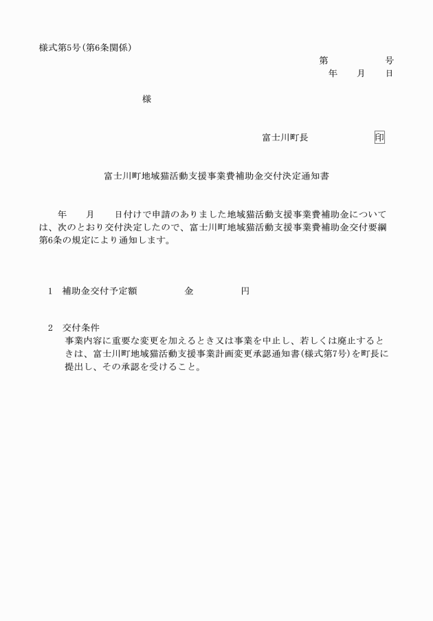 第5条 補助金の交付を受けようとする者は、あらかじめ富士川町地域猫活動支援事業費補助金交付申請書(様式第1号)に次に掲げる書類を添えて、町長に提出しなければならない。